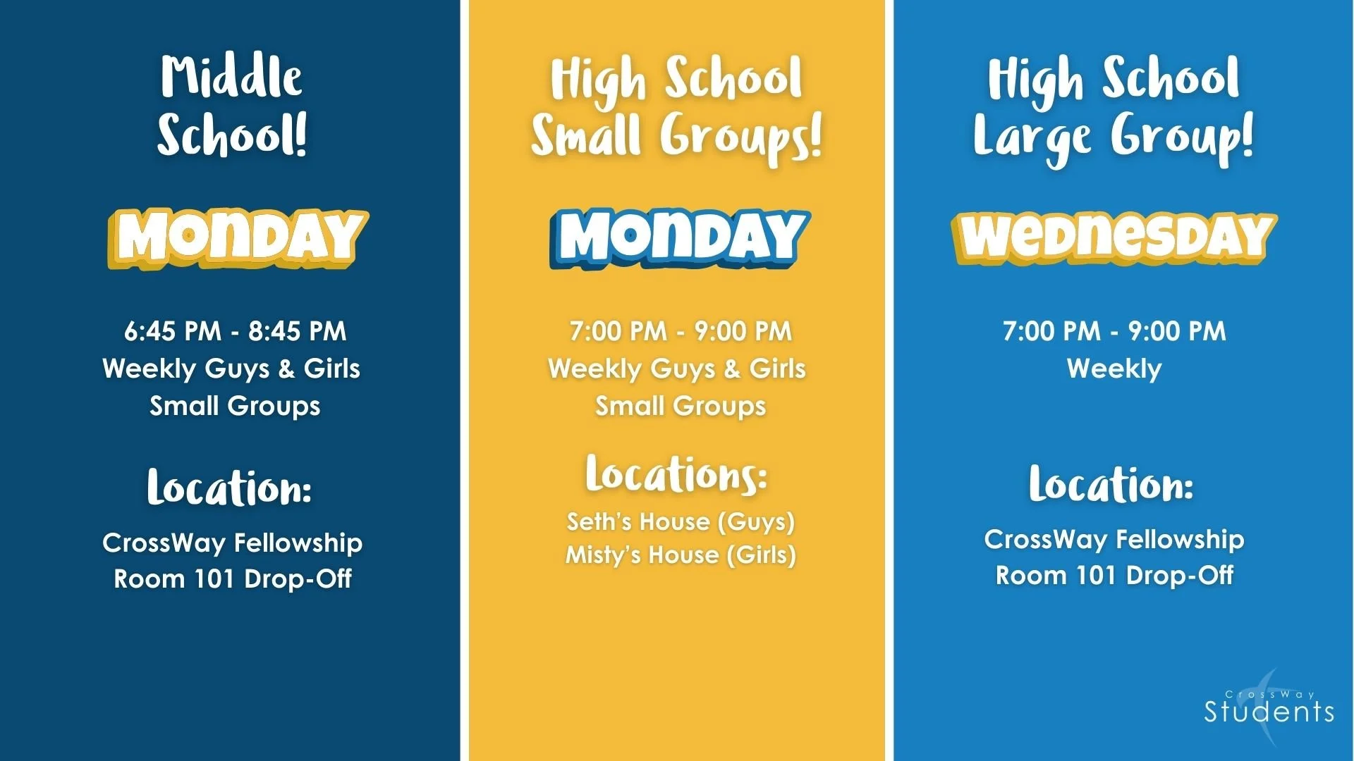 During the school year, our Middle School and High School small groups meet on Monday Nights. Middle School is at the church. High school is at their leaders’ homes. Our High School also meets for large group on Wednesday Night at the church. See below: