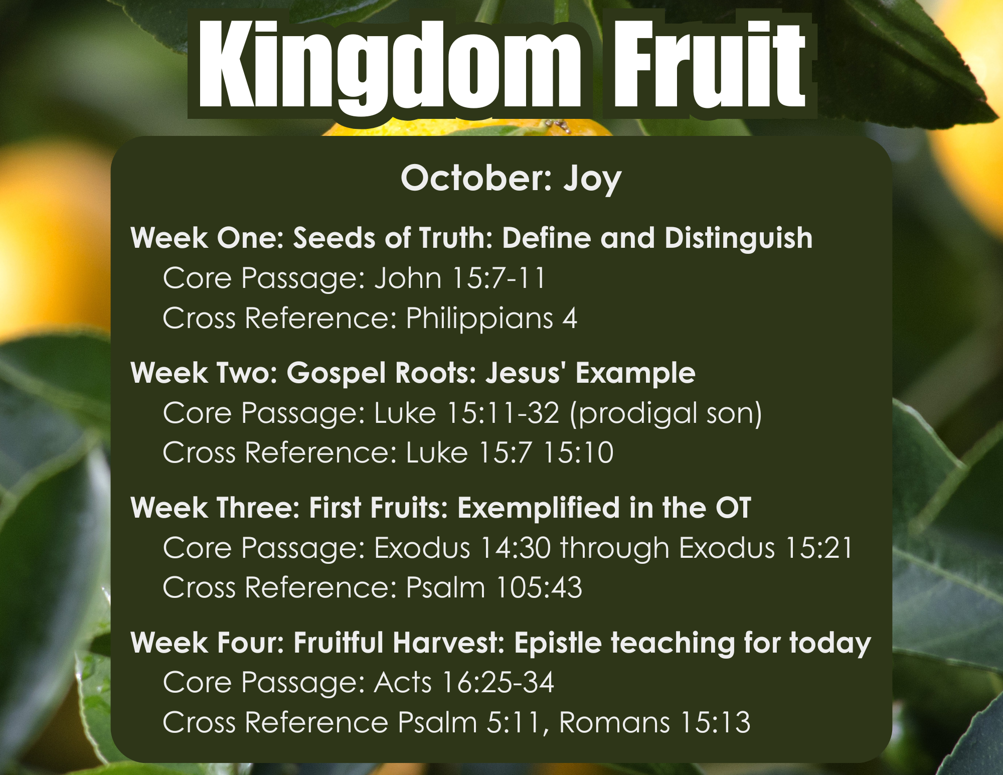 Meghan Heaton October 7, 2025 Fruit of the Spirit '25-'26 Joy—Kingdom Fruit Teaching Meghan Heaton October 7, 2025 Fruit of the Spirit '25-'26 If you missed Holly’s teaching on joy at this month’s Women’s Worship, you can listen here! This month’s study schedule: